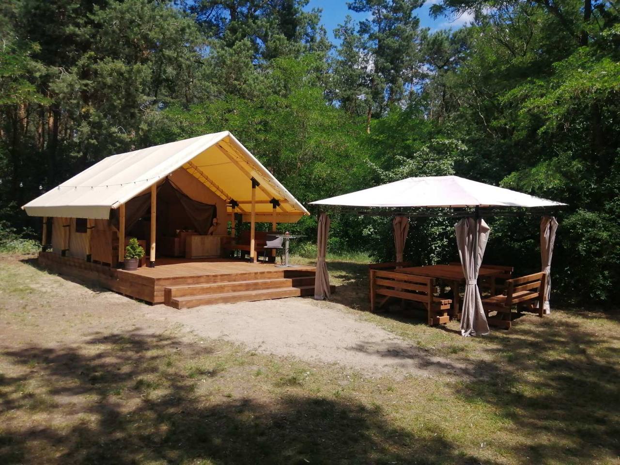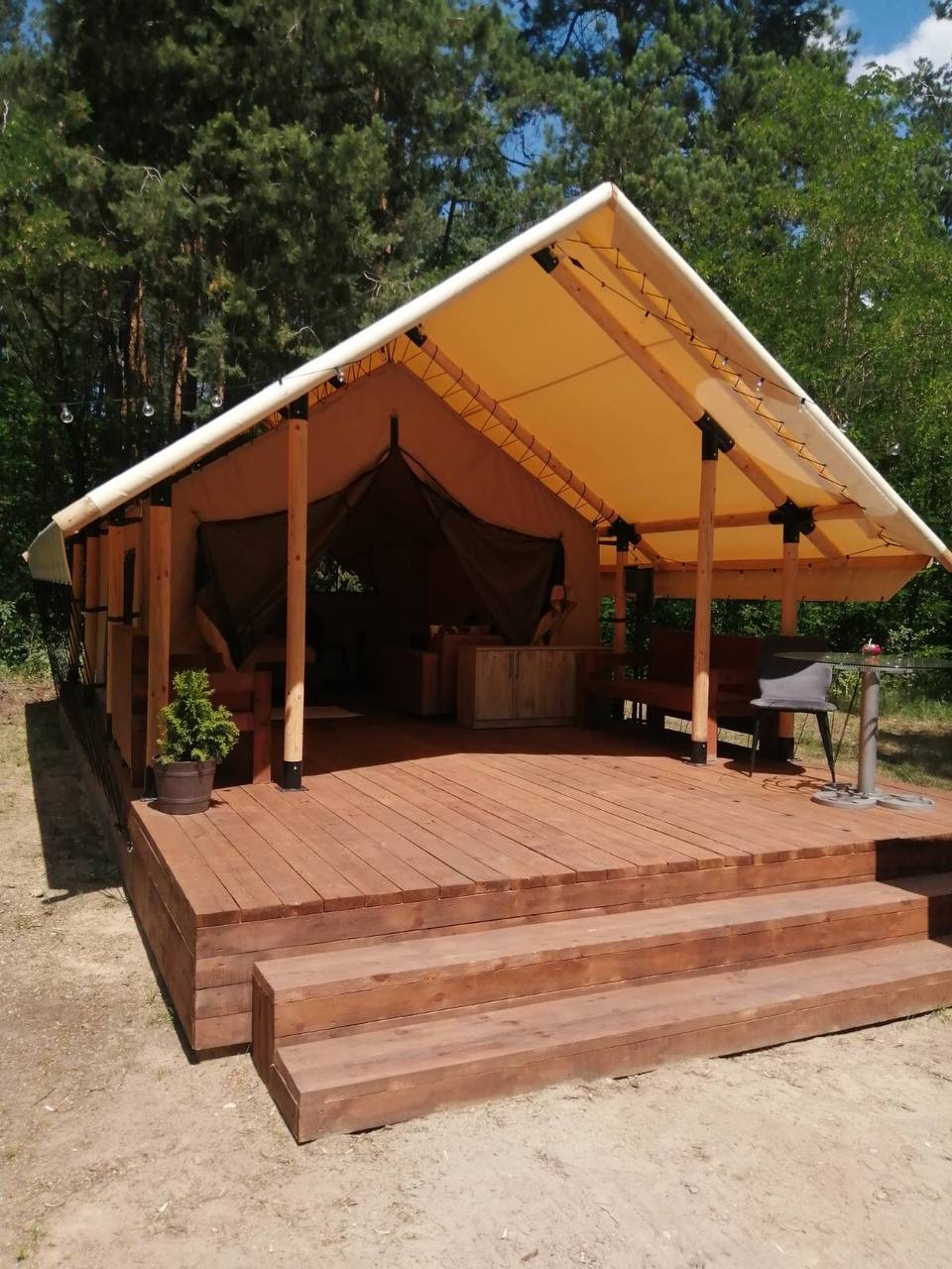 На базе отдыха «Парк Полянка» размещен наш глэмпинг шатёр с жилым пространством 4х4м и крытой террасой. Внутреннее пространство оборудовано всем необходимым для комфортного проживания на природе. Сафари тент сдаётся в посуточную аренду и дарит гостям новые впечатления от проживания на природе.